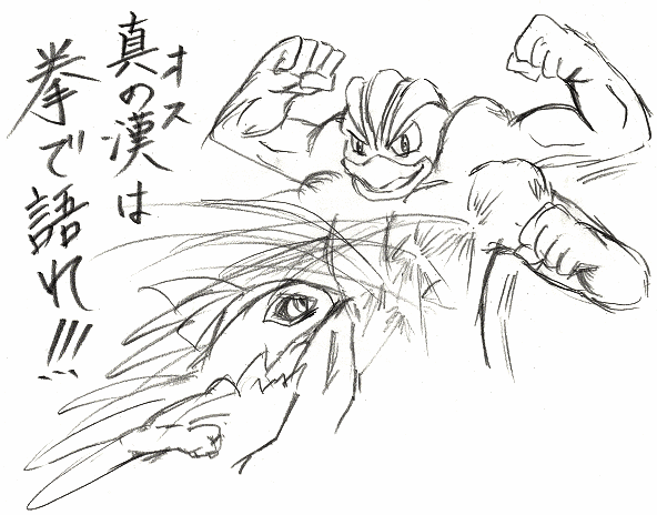 ここで技の応酬をするのではなく、ルチャブルの真意を確かめようと(恐らくビルドアップをして)構えるカイリキーの漢前カッコよさは漢であるサトシの純情ハート直撃だったと思う。少なくとも私の心は大打撃だぜ。燃え的な意味で。